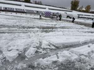 ぐちゃぐちゃ路面のところ、なんとか除雪してくれたスタッフに感謝しながら短縮された周回コースを走るよ。