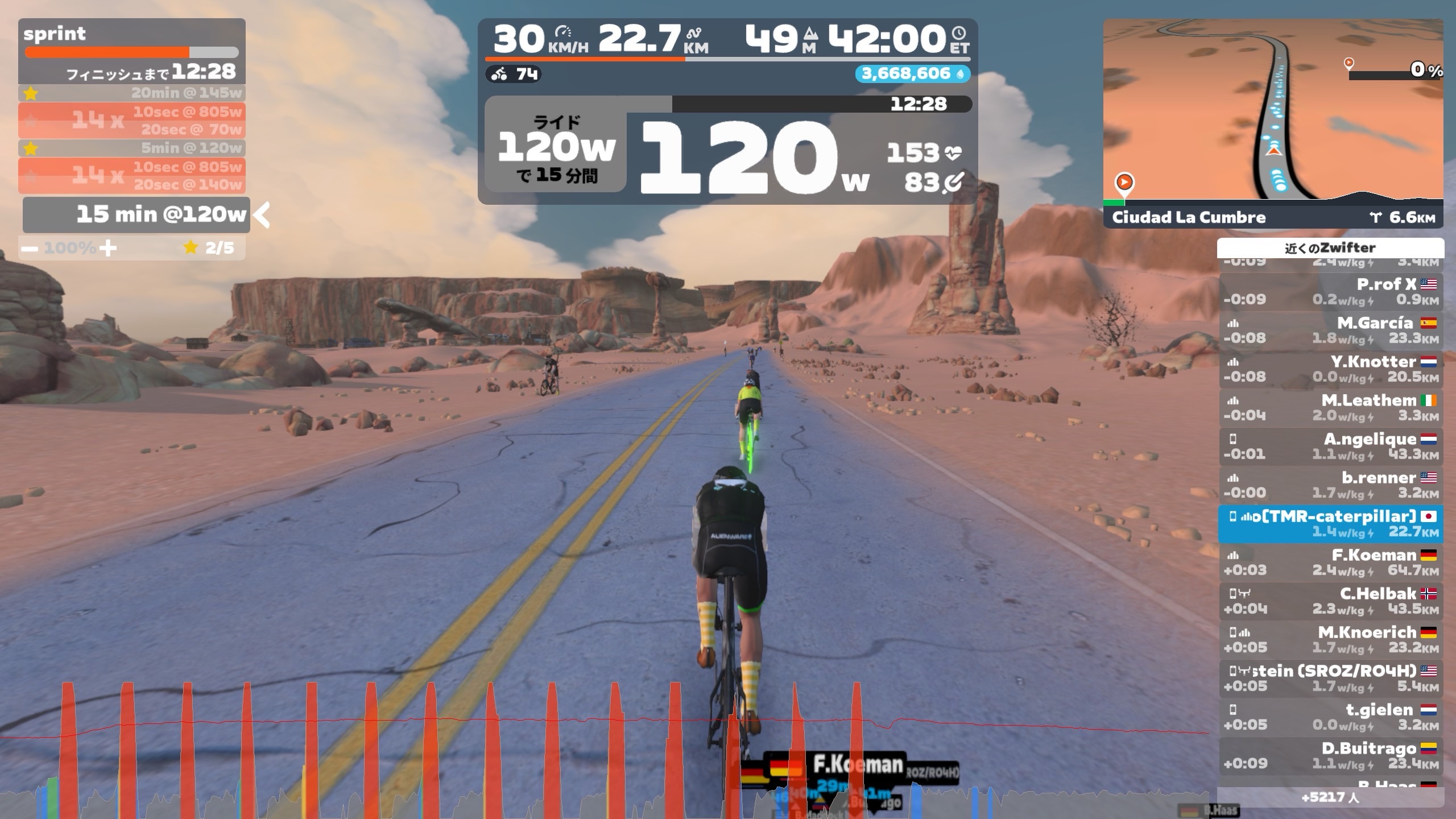 14本をヘロヘロになりながら終わって・・・・5分レスト120w・・・・