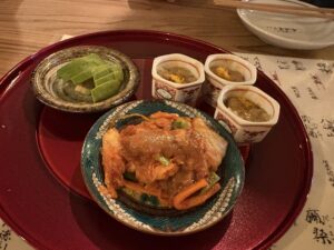 前菜いろいろ。野菜と海鮮と鶏肉と。