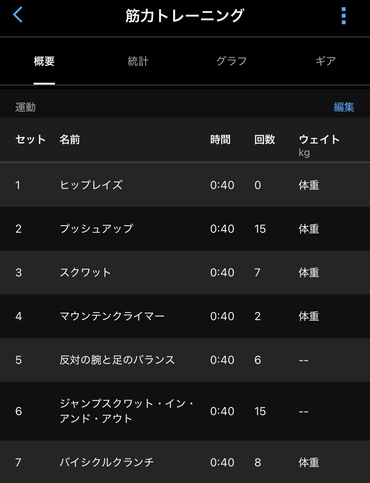 40秒やって20秒休む、そしてこの7種目を3セットなのですが
