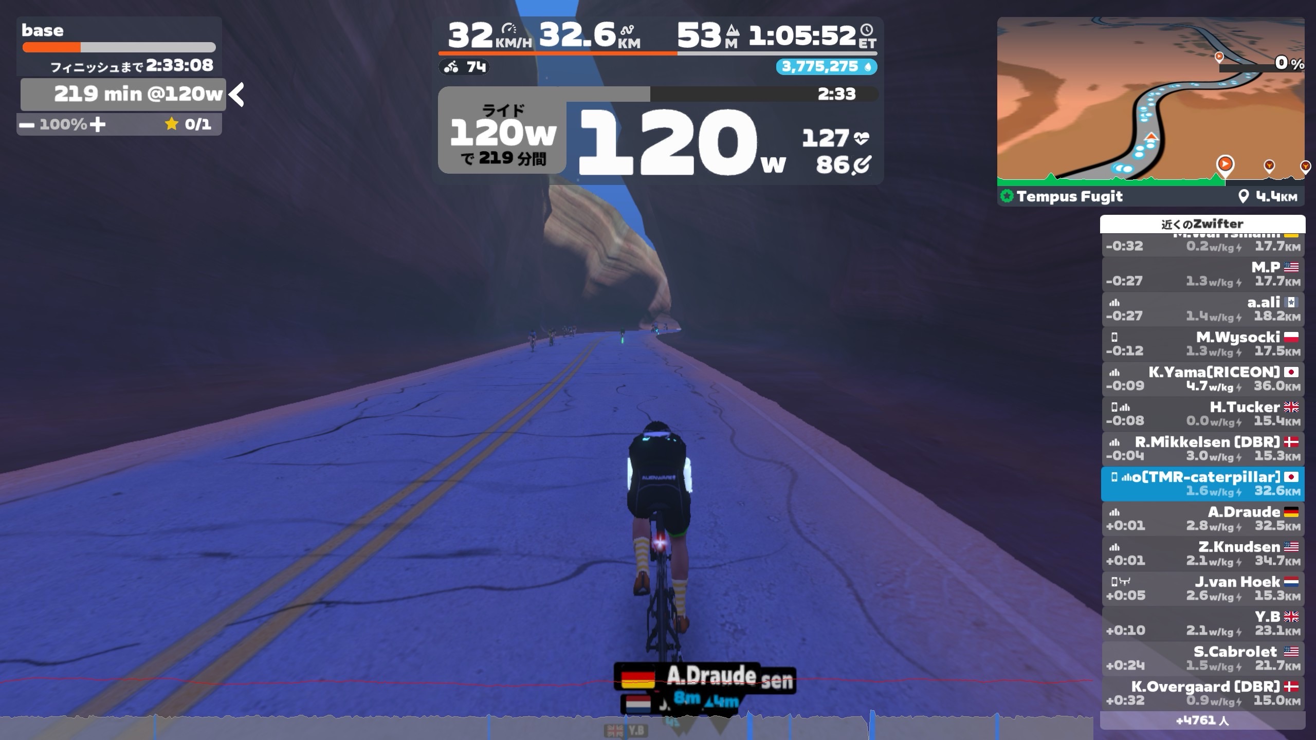 木曜 ベース(120w3時間39分)→スプリント(2×5×10秒@805w)