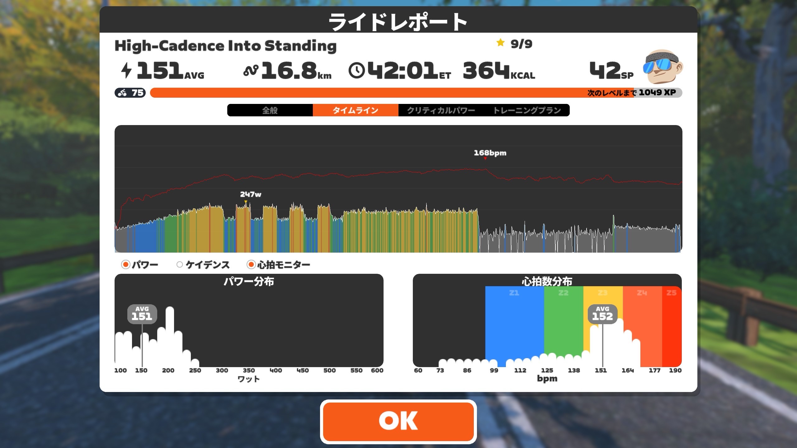 42分のメニュー。後半のグレーのギザギザは片足ペダリングである。